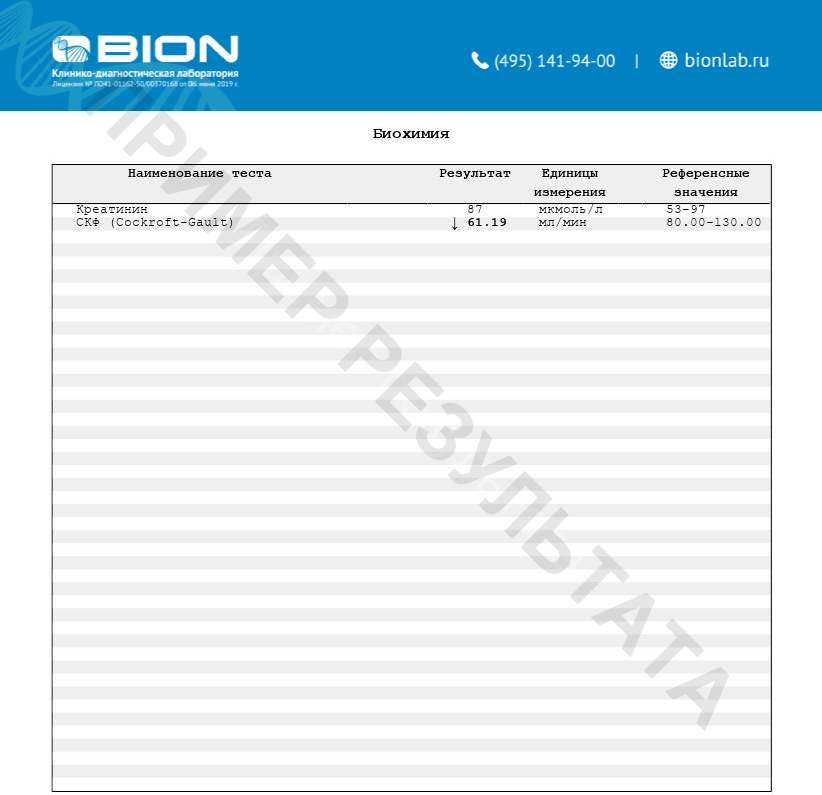Формула валидирована для пациентов от 18 до 70 лет. В результате исследования указывается концентрация креатинина в крови и скорость клубочковой фильтрации (СКФ).