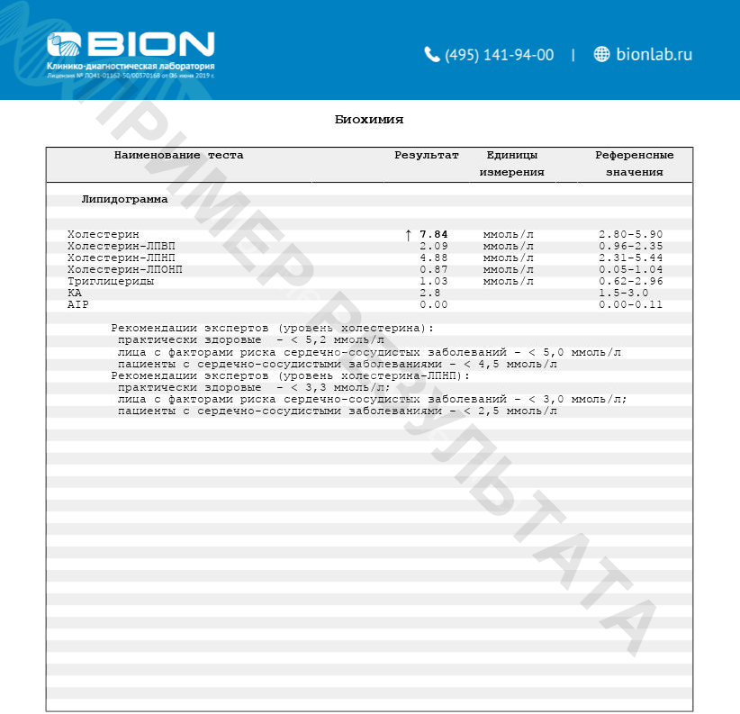 Липидограмма – комплексное исследование липидного обмена, включающая в себя такие тесты как: холестерин, холестерин-ЛПВП, холестерин-ЛПНП, триглицериды. По результатам этих тестов для оценки риска атеросклероза и ИБС рассчитывается концентрация холестерина-ЛПОНП (липопротеинов очень низкой плотности), коэффициент атерогенности (КА) по Климову и атерогенный индекс плазмы (AIP). Данное комплексное исследование позволяет как диагностировать нарушения липидного обмена, так и оценить риск развития атеросклероза и ишемической болезни сердца.