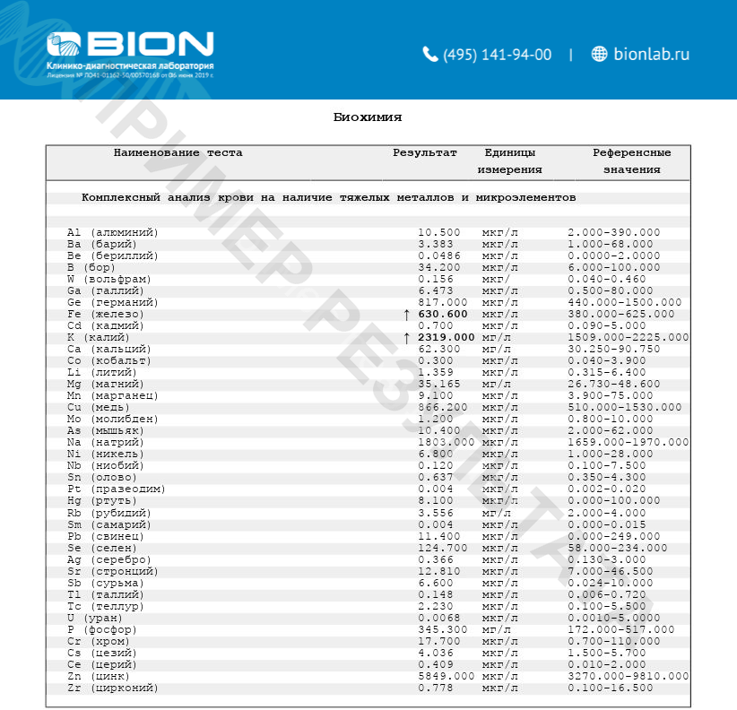 Комплексный анализ крови на макро- и микроэлементы (40 показателей) (Li, B, Na, Mg, Al, Be, K, Ca, P, Cr, Mn, Fe, Co, Ni, Cu, Zn, Ga, Ge, As, Se, Rb, Sr, Zr, Nb, Mo, Ag, Cd, Sn, Sb, Te, Cs, Ba, Ce, Pr, Sm, W, Hg, Tl, Pb, U)