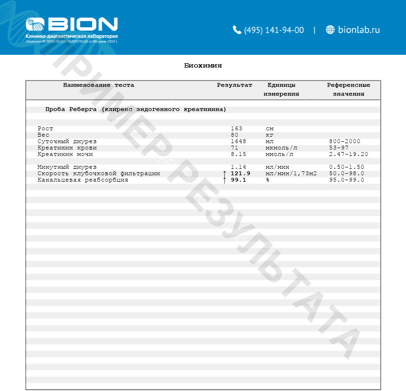 B009 Скорость клубочковой фильтрации (СКФ) (Cockroft-Gault); B010 Скорость клубочковой фильтрации (СКФ), формула Шварца (2009); B011 Скорость клубочковой фильтрации (СКФ) (MDRD); B012 Цистатин C + Скорость клубочковой фильтрации (СКФ) расчёт по формулу CKD-EPI-Cystatin C; C001 Общий анализ мочи