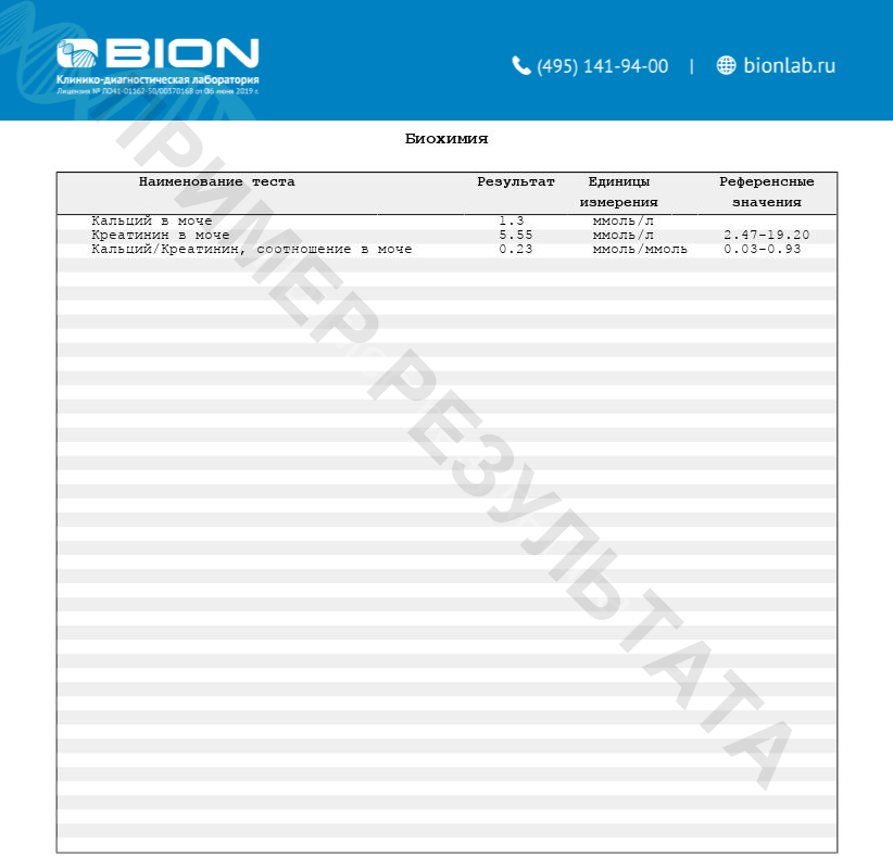 B130 Кальций общий; B284 Кальций (Ca) в моче; B269 Креатинин в моче