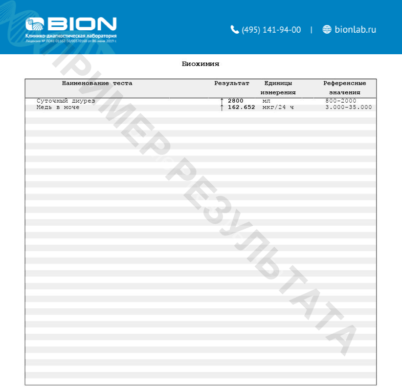 Определение концентрации меди в моче применяется для подтверждения болезни Вильсона-Коновалова и оценки эффективности лечения. Определение концентрации меди в моче позволяет диагностировать болезнь Вильсона-Коновалова — редкое врожденное нарушение метаболизма, наиболее распространенное среди лиц еврейской национальности, выходцев из Западной Европы, а также лиц, проживающих в северной Италии и сицилийцев. Свободные ионы меди ингибируют многие ферментативные процессы, оказывая при этом токсическое воздействие. В норме с мочой экскретируется лишь незначительное количество свободной меди.