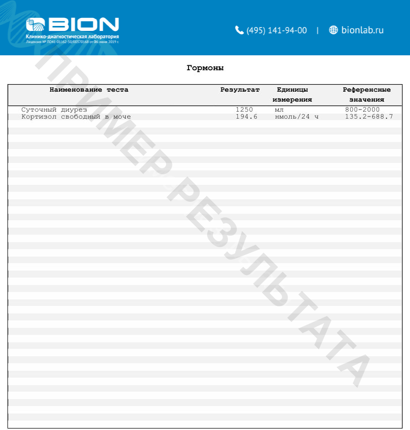 B555 Кортизол; B300 Кортизол в моче; B550 АКТГ (адренокортикотропный гормон); B570 Альдостерон