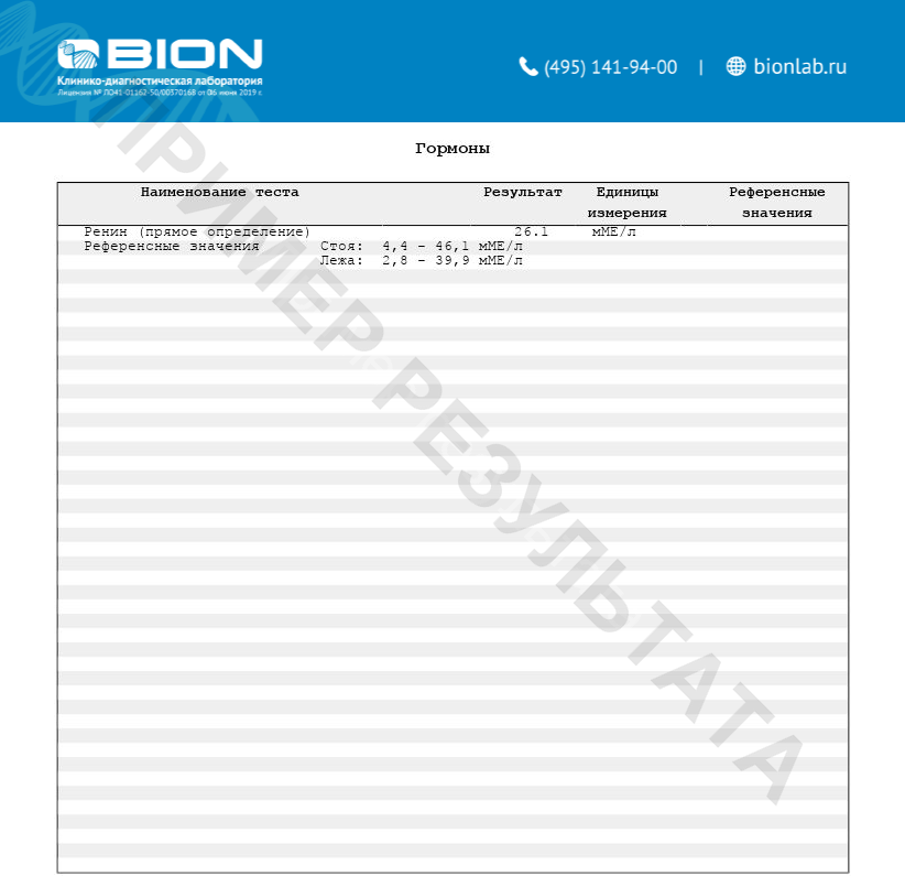 При данном методе исследования проводится прямое измерение концентрации ренина в плазме крови, поэтому измеренная концентрация не зависит от концентрации ангиотензиногена в плазме крови.
