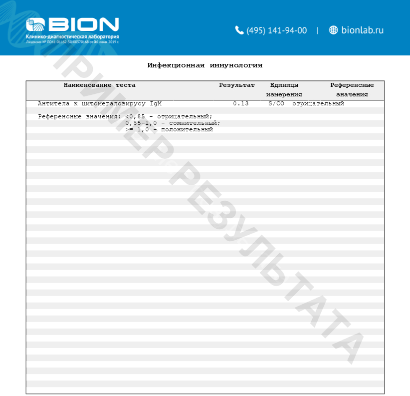 Отрицательный результат исследования антител класса IgM (при положительном результате исследования IgG-антител) свидетельствует о перенесенной ранее инфекции. Отрицательный результат исследования (при отрицательном результате исследования IgG- антител) свидетельствует об отсутствии заболевания, однако, при наличии клинической картины заболевания, не всегда исключает острую инфекцию (серонегативный период). В данном случае необходимо провести исследование IgM и IgG-антител к ЦМВ через 10-14 дней.