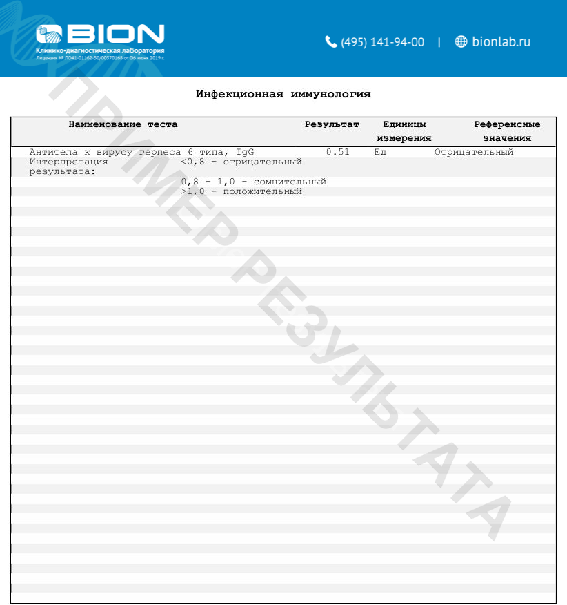 Антитела к вирусу герпеса 6 типа (anti-HHV 6), IgG - определение IgG-антител используется в скрининговых исследованиях для определения наличия иммунитета к ВГЧ-6А/В. Результаты определе-ния IgG-антител в количественном формате позволяют провести динамическое наблюдение, оценить состояние постинфекционного иммунитета к ВГЧ-6А/В.