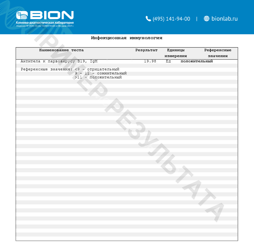 Положительный результат исследования свидетельствует о текущем или недавнем заболевании. Острая или недавняя (в предшествующие 3-5 месяцев) инфекция парвовирусом В19