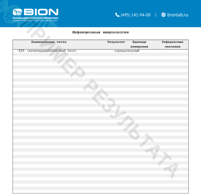 RPR - неспецифический антифосфолипидный (реагиновый) тест, современный аналог реакции Вассермана (RW), модификация VDRL (Venereal Disease Research Laboratory) теста. RPR - скрининговый нетрепонемный тест, выявляющий антитела (реагины) класса IgG и IgM к липоидному и липопротеиноподобному материалу, высвобождаемому из поврежденных клеток больного сифилисом. Тест RPR рекомендован приказом МЗ РФ № 87 от 26.03.2001 года для первичного скрининга и наблюдения за ходом лечения сифилиса. Антифосфолипидные антитела, выявляемые этим тестом, находят у 70 - 80% лиц с первичным сифилисом и почти у 100% пациентов с вторичным и ранним латентным сифилисом. В большинстве случаев позитивная RPR-реакция наблюдается через 7-10 дней после появления первичного шанкра, или через 3-5 недель после инфицирования. Титры снижаются после наступления вторичной стадии сифилиса. Около 30% пациентов с поздним сифилисом становятся нереактивными по RPR-тесту. Снижение титра RPR в 4 и более раз в течение 1 года после проведенной терапии подтверждает ее эффективность. В 90-98% случаев после лечения сифилиса результат RPR-теста становится отрицательным. Тест не является специфическим. Возможны ложноположительные результаты исследования при беременности, сахарном диабете, туберкулезе, онкологических заболеваниях, аутоиммунных заболеваниях, подагре, алкоголизме, наркомании, инфекционном мононуклеозе, энтеровирусных инфекциях, вирусных гепатитах, пневмонии. При получении положительного результата в RPR-тесте пациент должен обследоваться дерматовенерологом с повторным исследованием крови для определения антител к трепонемным антигенам Treponema pallidum методом ИФА или ИХЛА.