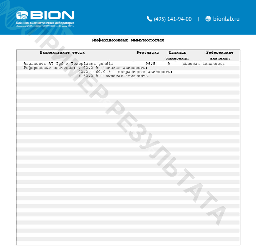 Определение авидности антител IgG к Toxoplasma gondii – проводиться в случае положительных результатов исследования на IgM- и IgG-антитела к Toxoplasma gondii для дифференциальной диагностики первичной (недавней) инфекции, реинфицирования или реактивации инфекции.