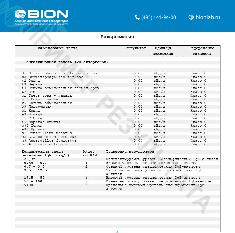 В отчете указывается результат каждого аллергена. Результаты исследований специфического IgE (sIgE) оцениваются по общепринятой шкале классов значений RAST.