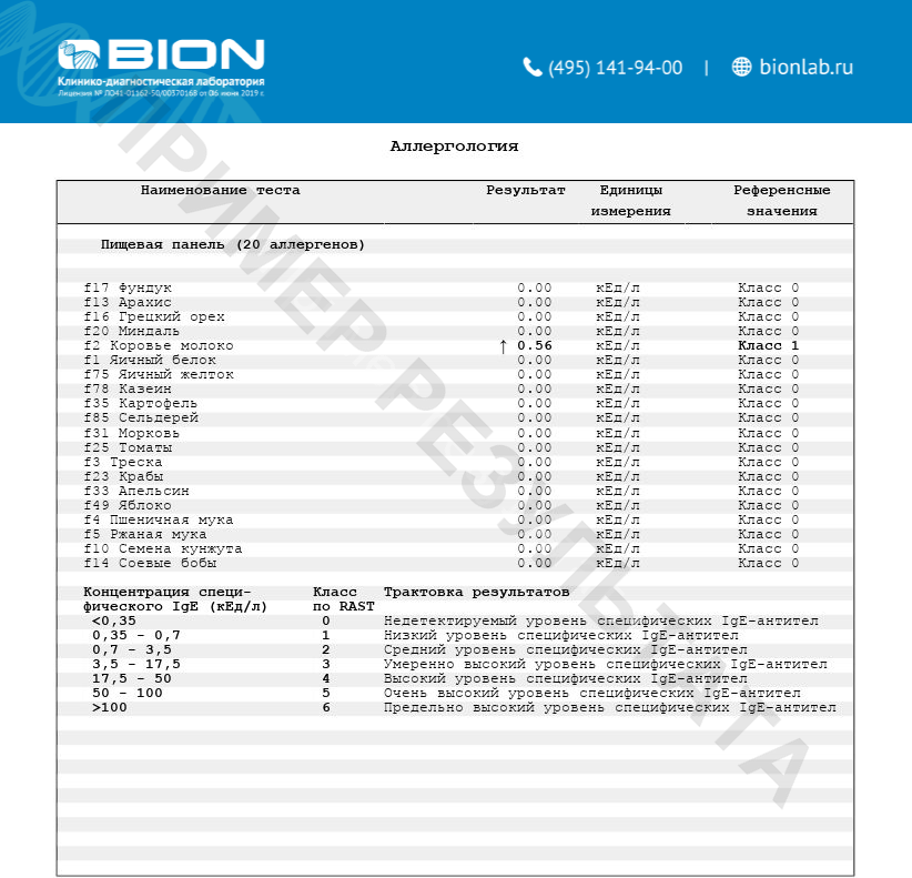 В отчете указывается результат каждого аллергена. Результаты исследований специфического IgE (sIgE) оцениваются по общепринятой шкале классов значений RAST.