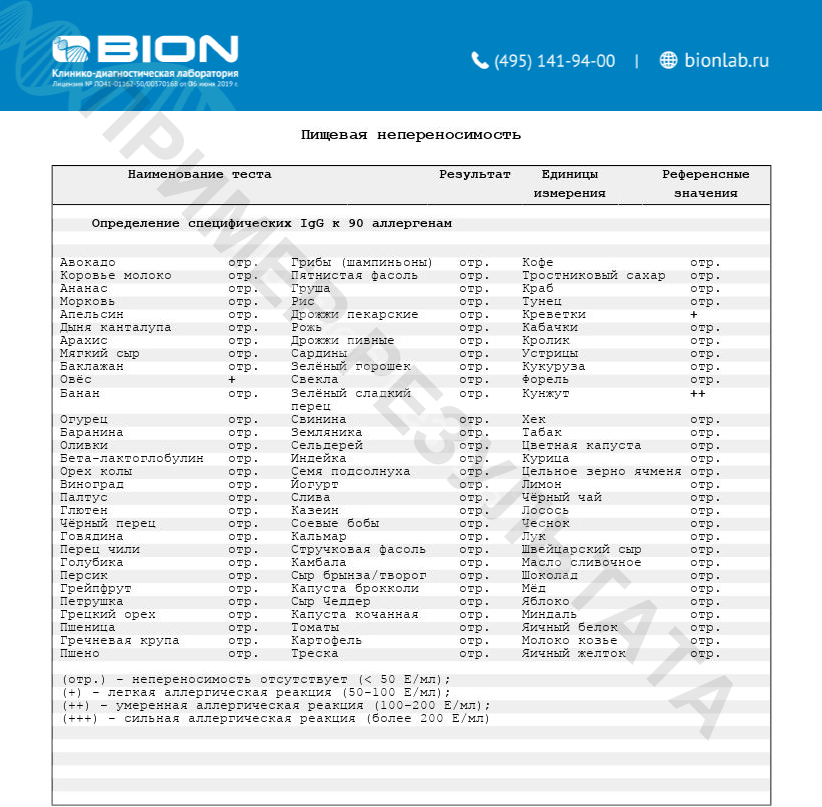 Панель для исследования на пищевую непереносимость включает в себя аллергены основных продуктов питания и специй, которые наиболее часто вызывают пищевую непереносимость: авокадо, коровье молоко, ананас, морковь, апельсин, дыня канталупа, арахис, мягкий сыр, баклажан, овёс, банан, огурец, баранина, оливки, бета-лактоглобулин, орех колы, виноград, палтус, глютен, чёрный перец, говядина, перец чили, голубика, персик, грейпфрут, петрушка, грецкий орех, пшеница, гречневая крупа, пшено, грибы (шампиньоны), пятнистая фасоль, груша, рис, дрожжи пекарские, рожь, дрожжи пивные, сардины, зелёный горошек, свекла, зелёный сладкий перец (p. capsicum), свинина, земляника, сельдерей, индейка, семя подсолнуха, йогурт, слива, казеин, соевые бобы, кальмар, стручковая фасоль, камбала, сыр брынза, капуста брокколи, сыр чеддер, капуста кочанная, томаты, картофель, треска, кофе, тростниковый сахар, краб, тунец, креветки, тыква, кролик, устрицы, кукуруза, форель, кунжут, хек, табак, цветная капуста, курица, цельное зерно ячменя, лимон, чёрный чай, лосось, чеснок, лук, швейцарский сыр, масло сливочное, шоколад, мёд, яблоко, миндаль, яичный белок, молоко козье, яичный желток.