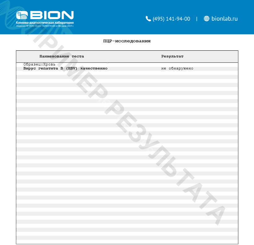 Обнаружение ДНК вируса гепатита В выполняют методом ПЦР. Для мониторинга противовирусной терапии необходимо использовать так называемые ультрачувствительные тесты, аналитическая чув- ствительность которых составляет 10 МЕ/мл и выше. Обнаружение в крови ДНК вируса гепатита В свидетельствует об инфицированности вирусам гепатита В. Отсутствие в крови ДНК вируса гепатита В свидетельствует об отсутствии инфекции.