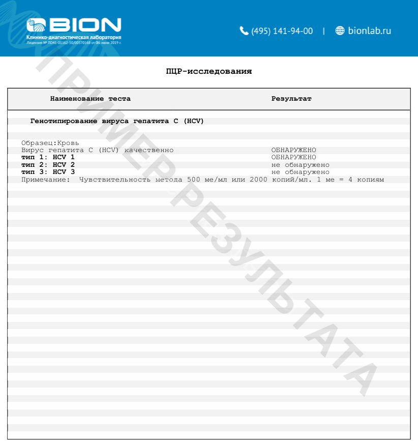 Генотип вируса гепатита C влияет на тяжесть заболевания, результат проводимой терапии. Схема лечения гепатита С, также зависит от генотипа вируса, вызвавшего заболевание. При проведении данного исследования проводиться определение РНК вируса гепатита C и только при его обнаружении проводится типирование вируса на типы 1, 2, 3.