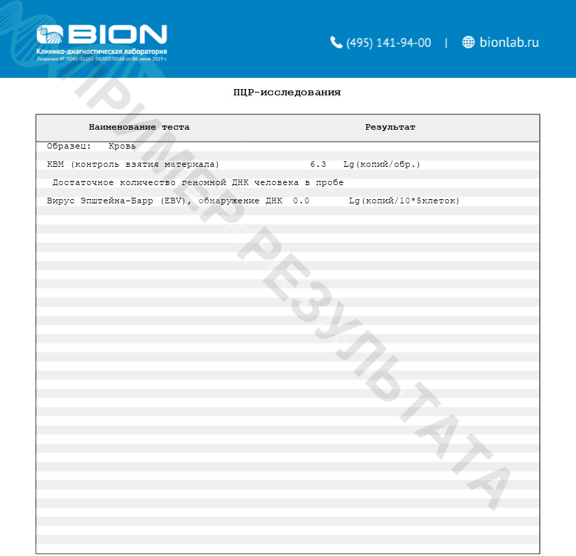 ДНК вируса Эпштейна-Барр (EBV) не обнаружена (0 Lg (копий/105 клеток)