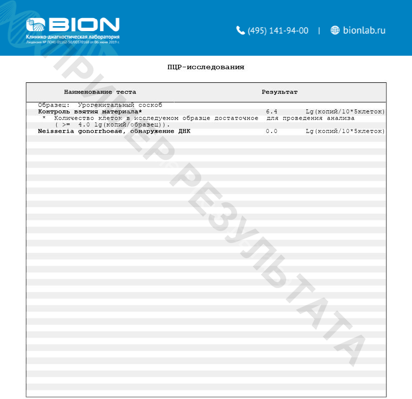 ДНК Neisseria gonorrhoeae в пробе пациента – свидетельствует о инфицировании Neisseria gonorrhoeae. Формат исследования — количественный.