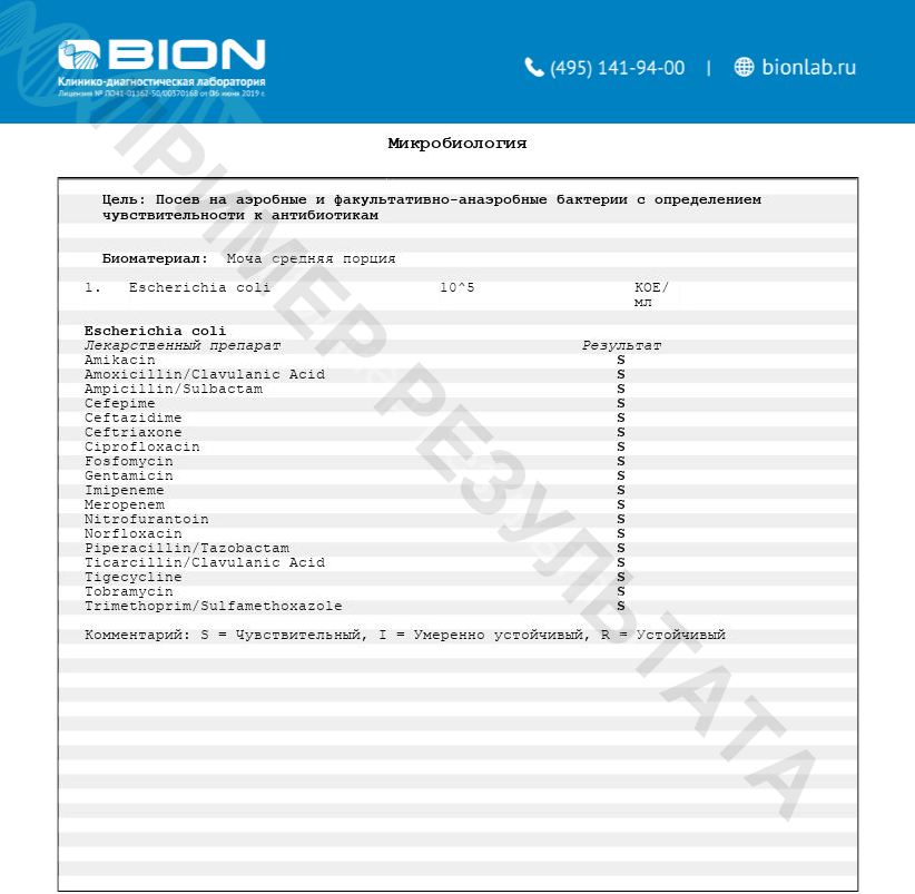 В результате исследования указывается наличие или отсутствие роста бактерий. При выявлении этиологически значимого возбудителя указывается вид возбудителя, степень бактериурии (в КОЕ/мл) и результат определения чувствительности к антимикробным препаратам. Перечень препаратов, к которым определяется чувствительность зависит от вида выделенного микроорганизма.