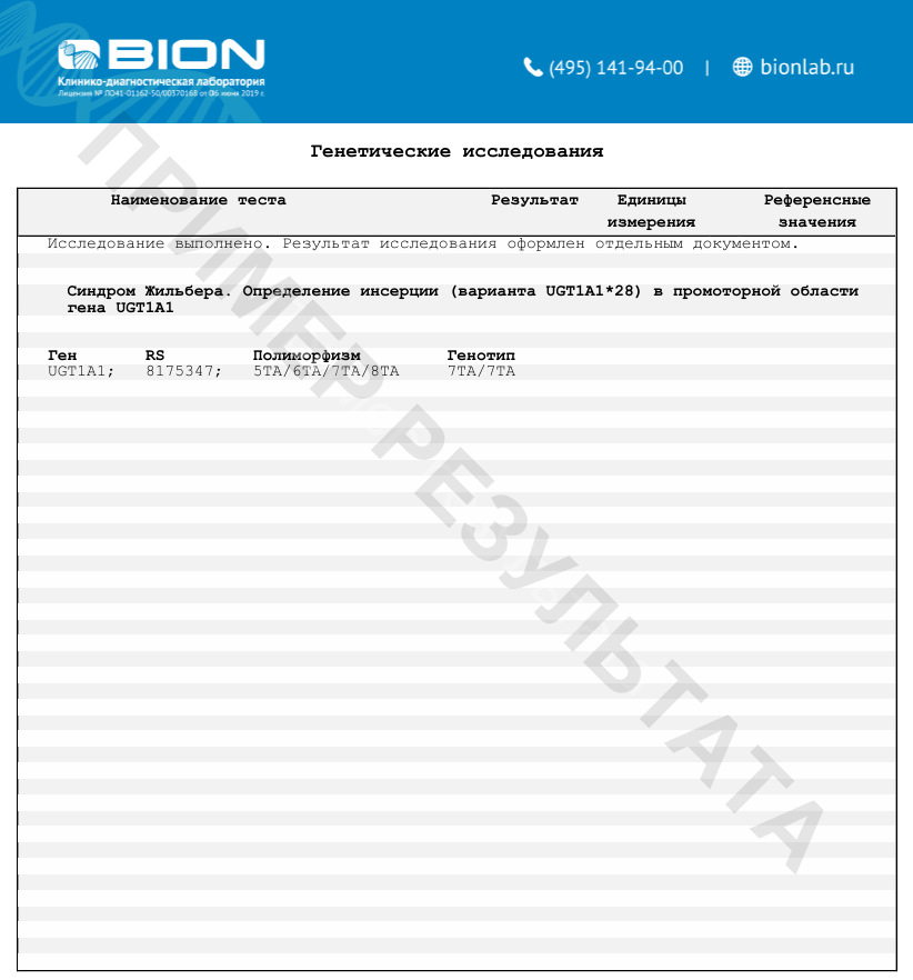 Определение числа TA-повторов в промоторе гена UGT1A1 имеет ключевое значение в диагностике синдрома Жильбера. Наиболее часто встречающимся дефектным аллелем, характерным для европеоидов и ассоциированным с развитием синдрома Жильбера, является UGT1A1*28, содержащий 7 TA-повторов. Аллель UGT1A1*37, включающий 8 TA-повторов, встречается реже и тоже приводит к снижению активности фермента уридинфосфатглюкуронил трансферазы в 1,5–2 раза. Другой редкий аллель, который повышает активность промотора, UGT1A1*36 содержит 5 TA-повторов. Ген UGT1A1 кодирует уридиндифосфатглюкуронозил трансферазу – фермент второй фазы метаболизма ксенобиотиков, который осуществляет реакцию конъюгирования различных соединений с глюкуроновой кислотой.